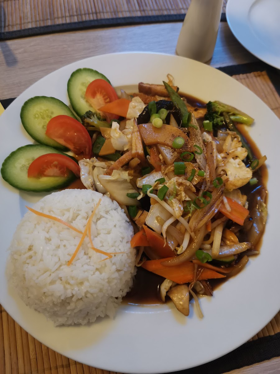 Passed by on a sunny day, noticed a small terrace and an offer of tofu with my favorite eggplant on the daily menu for 9.90. Excellent! The service is fast, friendly, the dish is pleasant to look at and tasty. And very high-quality and tasty white rice! Will gladly return.